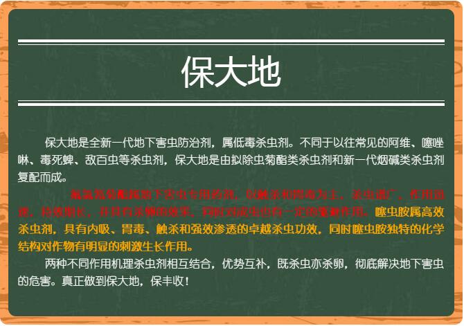 2、土壤處理:撒施顆粒劑,每畝使用保大地2-3袋,于傍晚時分均勻施撒于地面,可確保地下害蟲晚上出土?xí)r******殲殺。